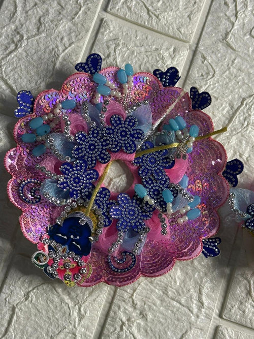 Enhance the divine beauty of Laddu Gopal Ji with this premium heavy designer dress, crafted with devotion and fine artistry. This beautifully designed poshak features rich pink and blue colors, heavy sequin work, pearls, beads, and elegant stone embellishments, giving Kanha Ji a truly royal and graceful look.